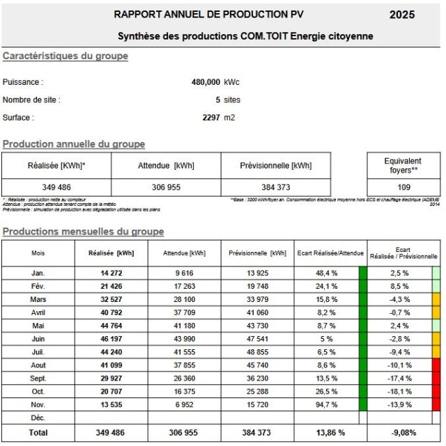 Production attendue en janvier 2025 : 9616 Kwh - production réalisée : 14 272 Kwh