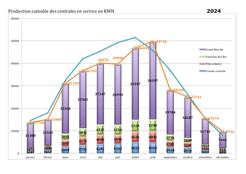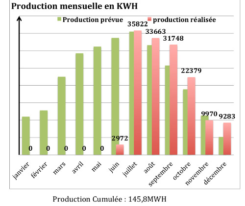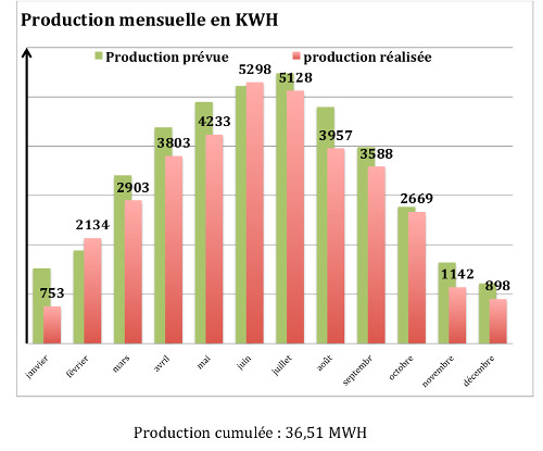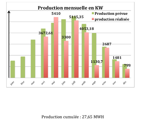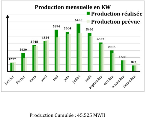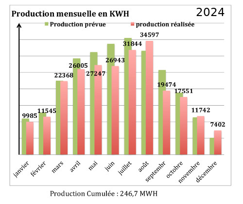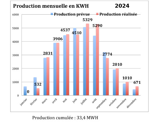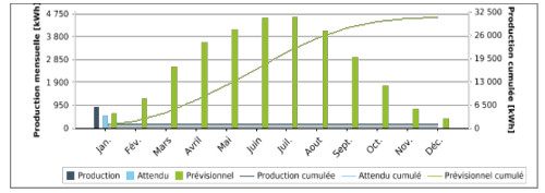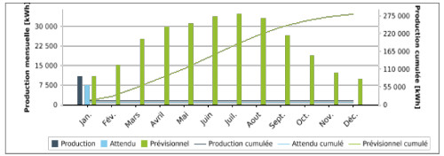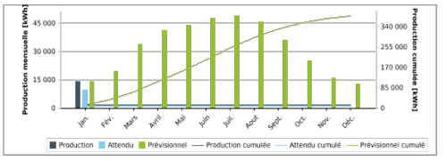 Production attendue en janvier 2025 : 9616 Kwh - production réalisée : 14 272 Kwh